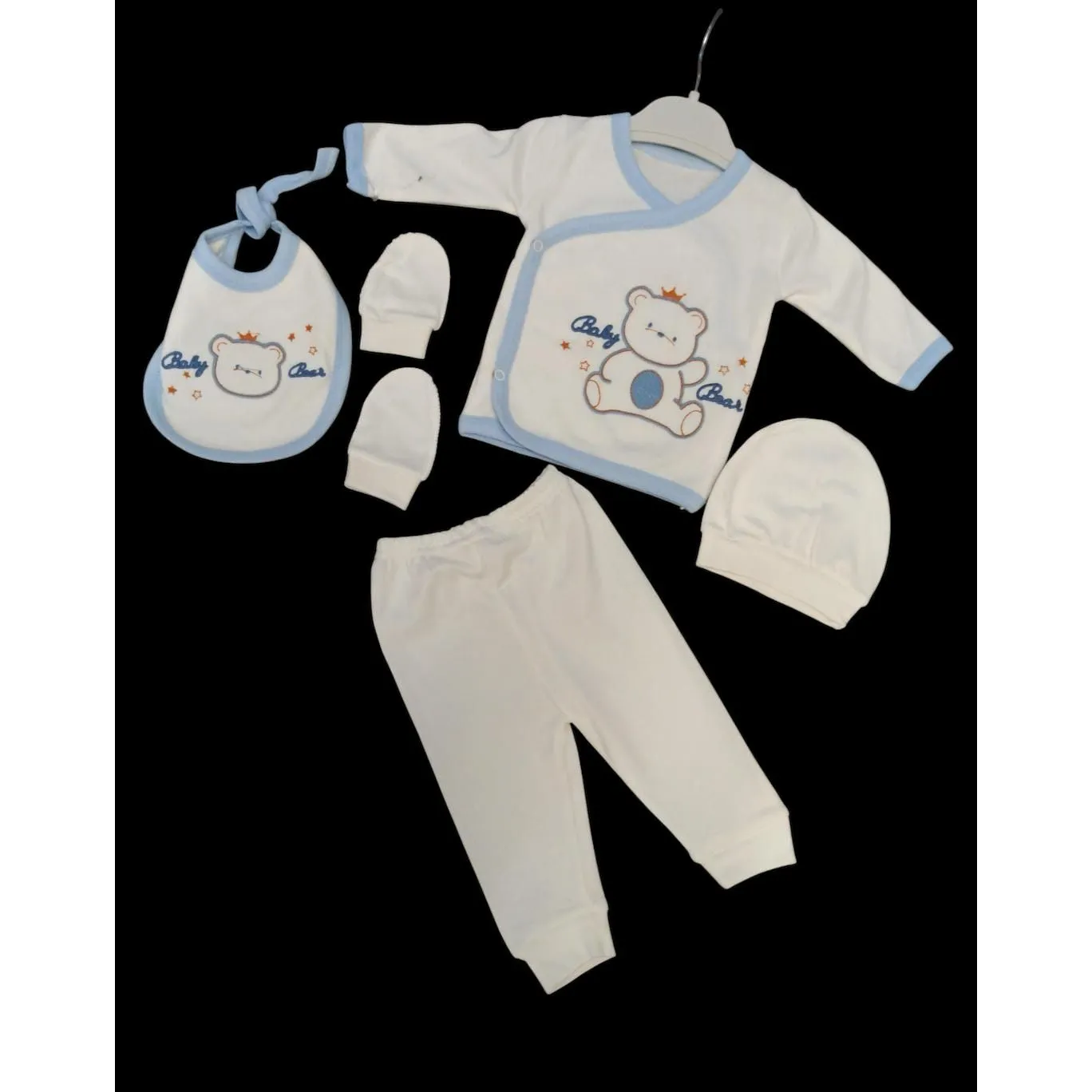Set ce conține 5 piese, cu model Baby Bear imprimat, băieți. Include: Bluză cu manecă lungă, pantaloni, o bavetă, o pereche manuși și o căciuliță.